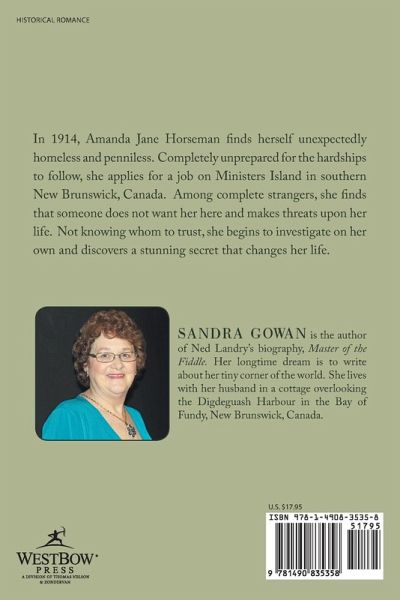 In 1914, Amanda Jane Horseman finds herself unexpectedly homeless and penniless. Completely unprepared for the hardships to follow, she applies for a job on Ministers Island in southern New Brunswick, Canada. Among complete strangers, she finds that someone does not want her here and makes threats upon her life. Not knowing whom to trust, she begins to investigate on her own and discovers a stunning secret that changes her life.