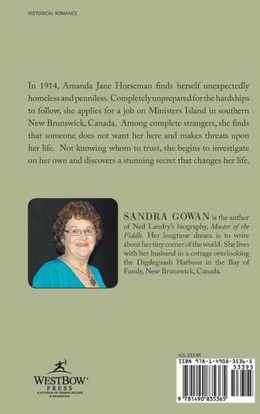 In 1914, Amanda Jane Horseman finds herself unexpectedly homeless and penniless. Completely unprepared for the hardships to follow, she applies for a job on Ministers Island in southern New Brunswick, Canada. Among complete strangers, she finds that someone does not want her here and makes threats upon her life. Not knowing whom to trust, she begins to investigate on her own and discovers a stunning secret that changes her life.