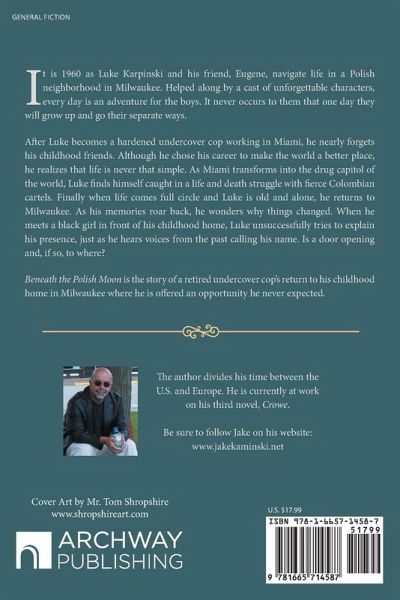 It is 1960 as Luke Karpinski and his friend, Eugene, navigate life in a Polish neighborhood in Milwaukee. Helped along by a cast of unforgettable characters, every day is an adventure for the boys. It never occurs to them that one day they will grow up and go their separate ways. After Luke becomes a hardened undercover cop working in Miami, he nearly forgets his childhood friends. Although he chose his career to make the world a better place, he realizes that life is never that simple. As Miami transforms into the drug capitol of the world, Luke finds himself caught in a life and death struggle with fierce Colombian cartels. Finally when life comes full circle and Luke is old and alone, he returns to Milwaukee. As his memories roar back, he wonders why things changed. When he meets a black girl in front of his childhood home, Luke unsuccessfully tries to explain his presence, just as he hears voices from the past calling his name. Is a door opening and, if so, to where? Beneath the Polish Moon is the story of a retired undercover cop's return to his childhood home in Milwaukee where he is offered an opportunity he never expected.