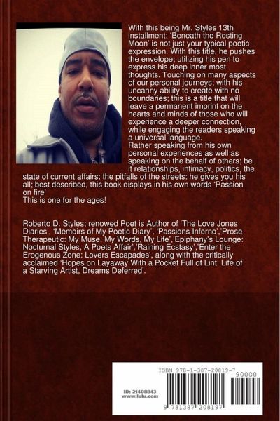 With this being Mr. Styles 13th installment; 'Beneath the Resting Moon' is not just your typical poetic expression. With this title, he pushes the envelope; utilizing his pen to express his deep inner most thoughts. Touching on many aspects of our personal journeys; with his uncanny ability to create with no boundaries; this is a title that will leave a permanent imprint on the hearts and minds of those who will experience a deeper connection, while engaging the readers speaking a universal language. Rather speaking from his own personal experiences as well as speaking on the behalf of others; be it relationships, intimacy, politics, the state of current affairs; the pitfalls of the streets; he gives you his all; best described, this book displays in his own words 'Passion on fire' This is one for the ages! Roberto D. Styles; renowed Poet is Author of 'The Love Jones Diaries', 'Memoirs of My Poetic Diary', 'Passions Inferno'