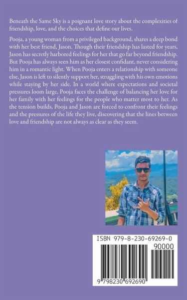 Beneath the Same Sky is a poignant love story about the complexities of friendship, love, and the choices that define our lives. Pooja, a young woman from a privileged background, shares a deep bond with her best friend, Jason. Though their friendship has lasted for years, Jason has secretly harbored feelings for her that go far beyond friendship. But Pooja has always seen him as her closest confidant, never considering him in a romantic light. When Pooja enters a relationship with someone else, Jason is left to silently support her, struggling with his own emotions while staying by her side. In a world where expectations and societal pressures loom large, Pooja faces the challenge of balancing her love for her family with her feelings for the people who matter most to her. As the tension builds, Pooja and Jason are forced to confront their feelings and the pressures of the life they live, discovering that the lines between love and friendship are not always as clear as they seem. Beneath the Same Sky explores themes of love, heartache, and the unspoken bonds that tie us together, even when distance and circumstance threaten to tear us apart. It's a story about the choices we make and the paths we walk-sometimes alone, sometimes with others-under the same sky.