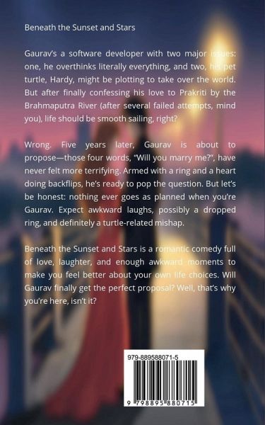 Beneath the Sunset and Stars Gaurav's a software developer with two major issues: one, he overthinks literally everything, and two, his pet turtle, Hardy, might be plotting to take over the world. But after finally confessing his love to Prakriti by the Brahmaputra River (after several failed attempts, mind you), life should be smooth sailing, right? Wrong. Five years later, Gaurav is about to propose-and no amount of coding can help him with this one. Armed with a ring and a heart doing backflips, he's ready to pop the question. But let's be honest: nothing ever goes as planned when you're Gaurav. Expect awkward laughs, possibly a dropped ring, and definitely a turtle-related mishap. Beneath the Sunset and Stars is a romantic comedy full of love, laughter, and enough awkward moments to make you feel better about your own life choices. Will Gaurav finally get the perfect proposal? Well, that's why you're here, isn't it?