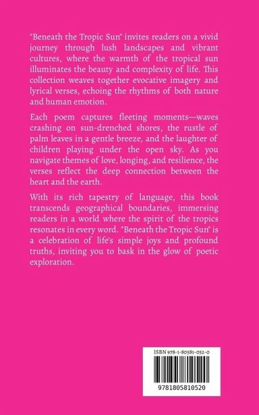 "Beneath the Tropic Sun" invites readers on a vivid journey through lush landscapes and vibrant cultures, where the warmth of the tropical sun illuminates the beauty and complexity of life. This collection weaves together evocative imagery and lyrical verses, echoing the rhythms of both nature and human emotion. Each poem captures fleeting moments-waves crashing on sun-drenched shores, the rustle of palm leaves in a gentle breeze, and the laughter of children playing under the open sky. As you navigate themes of love, longing, and resilience, the verses reflect the deep connection between the heart and the earth. With its rich tapestry of language, this book transcends geographical boundaries, immersing readers in a world where the spirit of the tropics resonates in every word. "Beneath the Tropic Sun" is a celebration of life's simple joys and profound truths, inviting you to bask in the glow of poetic exploration.