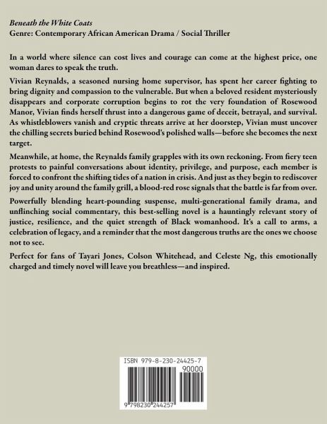 Beneath the White Coats Genre: Contemporary African American Drama / Social Thriller In a world where silence can cost lives and courage can come at the highest price, one woman dares to speak the truth. Vivian Reynalds, a seasoned nursing home supervisor, has spent her career fighting to bring dignity and compassion to the vulnerable. But when a beloved resident mysteriously disappears and corporate corruption begins to rot the very foundation of Rosewood Manor, Vivian finds herself thrust into a dangerous game of deceit, betrayal, and survival. As whistleblowers vanish and cryptic threats arrive at her doorstep, Vivian must uncover the chilling secrets buried behind Rosewood's polished walls-before she becomes the next target. Meanwhile, at home, the Reynalds family grapples with its own reckoning. From fiery teen protests to painful conversations about identity, privilege, and purpose, each member is forced to confront the shifting tides of a nation in crisis. And just as they begin to rediscover joy and unity around the family grill, a blood-red rose signals that the battle is far from over. Powerfully blending heart-pounding suspense, multi-generational family drama, and unflinching social commentary, this best-selling novel is a hauntingly relevant story of justice, resilience, and the quiet strength of Black womanhood. It's a call to arms, a celebration of legacy, and a reminder that the most dangerous truths are the ones we choose not to see. Perfect for fans of Tayari Jones, Colson Whitehead, and Celeste Ng, this emotionally charged and timely novel will leave you breathless-and inspired.