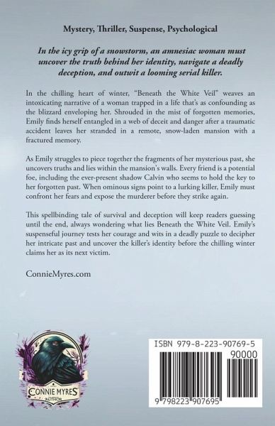 In the chilling heart of winter, "Beneath the White Veil" unveils an intoxicating narrative of a woman trapped in a life that's as confounding as the blizzard enveloping her. Shrouded in the mist of forgotten memories, Emily is entangled in a web of deceit and danger she must unravel before time runs out. A traumatic accident leaves Emily stranded in a remote, snow-laden mansion with a fractured memory. As she struggles to piece together the fragments of her past, she discovers her life is far from ordinary. Yet, as truths are unearthed, so are lies, each one darker and more dangerous than the last. Intrigue and treachery lie within the mansion's walls. Every friend is a potential foe. Calvin, the ever-present shadow, seems to hold the key to her forgotten past. But can he be trusted? Then there's Gabe, her high school flame, who rekindles an old spark. Is it love or is it a mask concealing a deadly secret? When her dog Baxter fetches an ominous sign of a lurking killer, Emily finds herself at the crossroads of a deadly puzzle. With the storm raging outside and her memories returning in chilling flashes, Emily must confront her fears and expose the murderer before they strike again. "Beneath the White Veil" is an enthralling murder mystery filled with suspense and unexpected twists. It weaves a compelling tale of survival and the tenacity of the human spirit, even when ensnared in the coldest clutches of fear. Emily's quest for the truth takes her on a suspenseful journey that tests her courage, wits, and resilience. Will she decipher the intricate puzzle of her past and uncover the killer's identity, or will the chilling winter claim her as its next victim? This spellbinding novel will keep readers captivated from the first snowflake to the last, always wondering what lies Beneath the White Veil.