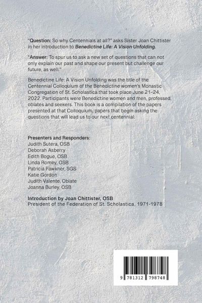 Benedictine Life: A Vision Unfolding is about a vision-a vision that arose more than 1,500 years ago when St. Benedict penned his rule for monks. A 21st century way forward for this tradition will arise only when we immerse ourselves in its wisdom teaching and emulate the witness of those who have invested their lives in it over many centuries. Only then will the vision unfold for us. Benedictine Life: A Vision Unfolding was also the title of the Centennial Colloquium of the Benedictine women's Monastic Congregation of St. Scholastica that took place June 21-24, 2022. Participants were Benedictine women and men, professed, oblates and seekers. This book is a compilation of the papers presented at that Colloquium, with the addition of an introduction by Benedictine Sister Joan Chittister who served as president of the Congregation from 1971-1978. These are the presenters and responders whose papers you will find in this book: Judith Sutera, OSB, Deborah Asberry, Edith Bogue, OSB, Linda Romey, OSB, Patricia Fawkner, SGS, Katie Gordon, Judith Valente, Oblate, Joanna Burley, OSB. May the insights and questions they present guide us into the next 100 years.