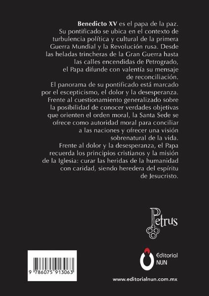 Benedicto XV es el papa de la paz. Su pontificado se ubica en el contexto de turbulencia político y cultural de la primera Guerra Mundial y la Revolución Rusa. Desde las heladas trincheras de la Gran Guerra hasta las calles encendidas de Petrogrado, el Papa difunde con valentía su mensaje de reconciliación. El panorama de su pontificado está marcado por el escepticismo, el dolor y la desesperanza. Frente al cuestionamiento generalizado sobre la posibilidad de conocer verdades objetivas que orienten el orden moral, la Santa Sede se ofrece como autoridad moral para conciliar a las naciones y ofrecer una visión sobrenatural de la vida. Frente al dolor y la desesperanza, el Papa recuerda los principios cristianos y la misión de la Iglesia: curar las heridas de la humanidad con caridad, siendo heredera del espíritu de Jesucristo. Benedicto XV es el papa de la paz. Su pontificado se ubica en el contexto de turbulencia político y cultural de la primera Guerra Mundial y la Revolución Rusa. Desde las heladas trincheras de la Gran Guerra hasta las calles encendidas de Petrogrado, el Papa difunde con valentía su mensaje de reconciliación. El panorama de su pontificado está marcado por el escepticismo, el dolor y la desesperanza. Frente al cuestionamiento generalizado sobre la posibilidad de conocer verdades objetivas que orienten el orden moral, la Santa Sede se ofrece como autoridad moral para conciliar a las naciones y ofrecer una visión sobrenatural de la vida. Frente al dolor y la desesperanza, el Papa recuerda los principios cristianos y la misión de la Iglesia: curar las heridas de la humanidad con caridad, siendo heredera del espíritu de Jesucristo.