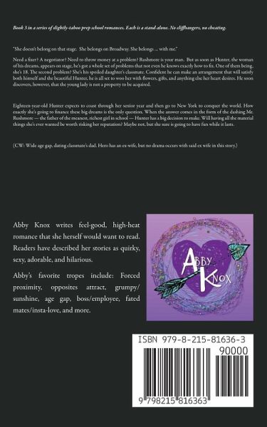 Book 3 in a series of slightly-taboo prep school romances. Each is a stand alone. No cliffhangers, no cheating. "She doesn't belong on that stage. She belongs on Broadway. She belongs … with me." Need a fixer? A negotiator? Need to throw money at a problem? Rushmore is your man. But as soon as Hunter, the woman of his dreams, appears on stage, he's got a whole set of problems that not even he knows exactly how to fix. One of them being, she's 18. The second problem? She's his spoiled daughter's classmate. Confident he can make an arrangement that will satisfy both himself and the beautiful…mehr