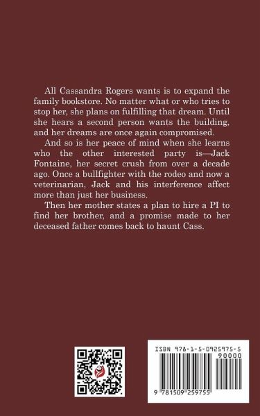 All Cassandra Rogers wants is to expand the family bookstore. No matter what or who tries to stop her, she plans on fulfilling that dream. Until she hears a second person wants the building, and her dreams are once again compromised. And so is her peace of mind when she learns who the other interested party is-Jack Fontaine, her secret crush from over a decade ago. Once a bullfighter with the rodeo and now a veterinarian, Jack and his interference affect more than just her business. Then her mother states a plan to hire a PI to find her brother, and a promise made to her deceased father comes back to haunt Cass.
