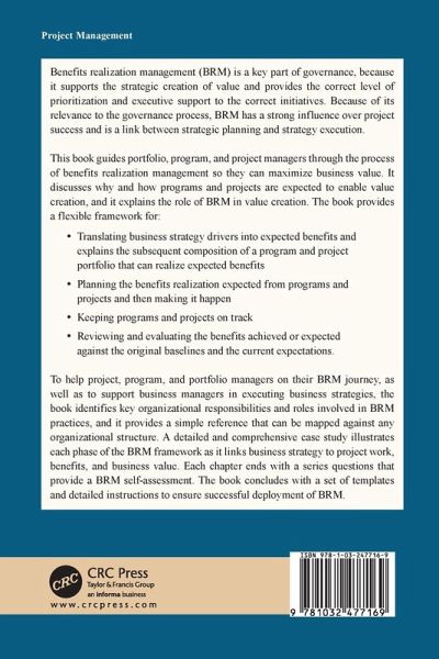 Benefits realization management (BRM) is a key part of governance, because it supports the strategic creation of value and provides the correct level of prioritization and executive support to the correct initiatives. Because of its relevance to the governance process, BRM has a strong influence over project success and is a link between strategic planning and strategy execution. This book guides portfolio, program, and project managers through the process of benefits realization management so they can maximize business value. It discusses why and how programs and projects are expected to enable value creation, and it explains the role of BRM in value creation. The book provides a flexible framework for: Translating business strategy drivers into expected benefits and explains the subsequent composition of a program and project portfolio that can realize expected benefits Planning the benefits realization expected from programs and projects and then making it happen Keeping programs and projects on track Reviewing and evaluating the benefits achieved or expected against the original baselines and the current expectations. To help project, program, and portfolio managers on their BRM journey, as well as to support business managers in executing business strategies, the book identifies key organizational responsibilities and roles involved in BRM practices, and it provides a simple reference that can be mapped against any organizational structure. A detailed and comprehensive case study illustrates each phase of the BRM framework as it links business strategy to project work, benefits, and business value. Each chapter ends with a series questions that provide a BRM self-assessment. The book concludes with a set of templates and detailed instructions to ensure successful deployment of BRM.