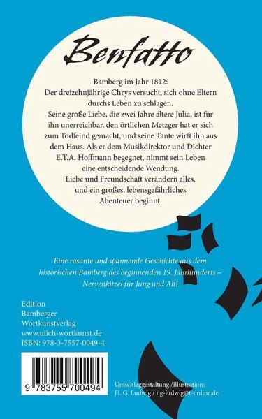 Bamberg im Jahr 1812. Chrys hat kein Zuhause, möchte aber unbedingt Lesen und Schreiben lernen. Als er auf den Dichter und Musikdirektor E.T.A. Hoffmann trifft, nutzt er die Chance und heftet er sich an dessen Fersen. Hoffmann erkennt den Bildungshunger und die Sehnsucht des Junge nach sozialem Aufstieg, und wird, wenn auch widerwillig, zu seinem Mentor. Chrys kommt einer Bande in die Quere, die verdorbenes Fleisch verkauft. Er wird verfolgt, sein Leben ist bedroht, und außerdem muss er auch noch erleben, wie Julia, seine erste große Liebe, mit einem anderen verlobt wird.Ein spannender historischer Roman zum E.T.A. Hoffmann-Jubiläum 2022, der nicht nur Jugendlichen den Atem raubt!Pressestimmen zu Benfatto:Dem fränkischen Autor Andreas Ulich glückt mit Benfatto ein famoser historischer Roman. Benfatto ist ein famoser Einstieg ins Hoffmann-Jubiläumsjahr 2022.(Fränkischer Tag, 10.12.2021)Eine wunderbare Hommage, pünktlich zu Hoffmanns jubilierenden Todestag, der im kommenden Jahr ineinem bundesweiten und internationalen Jubiläum gefeiert wird. Ben fatto!(Art.5/III, Dezember 2021)