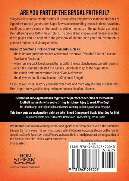 Welcome to the Jungle-of Faith Whether you have been a Bengals fan for decades or just a few days, Bengal Believer will inspire you to celebrate being a fan of a team that has had its highs and lows. Bengal Believer recounts the stories of 52 true plays and players spanning decades of legendary football games, from Super Bowls to heartrending losses. In these devotions, you'll get to relive some of the most incredible moments in Bengal history all while strengthening your faith with Scripture. The biblical and inspirational messages within these pages can be applied to the playbook of life and help you find inspiration in personal moments of victory or defeat. So, grab your orange and black, start your "who-dey" chant, and get ready to be inspired.