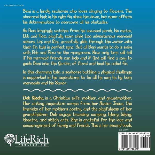 Beni is a kindly seahorse who loves clinging to flowers. The abnormal kink in his right fin slows him down, but never affects his determination to overcome all his obstacles. As Beni longingly watches from his seaweed perch, his mates, Ebb and Flow, playfully swim while two adventurous mermaid sisters, Lini and Rini, gracefully glide through the water with their fin tails in perfect sync. But all Beni wants to do is swim with Ebb and Flow to the mangroves. Now only time will tell if his mermaid friends can help and if God will find a way to guide Beni into the Garden of Coral and heal his coiled fin. In this charming tale, a seahorse battling a physical challenge is supported in his aspirations to be all he can be by twin mermaids and his Savior.