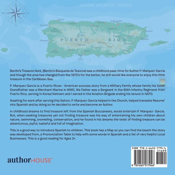Benito's Treasure Hunt, (Benito's Búsqueda de Tesoros) was a childhood pass-time for Author P. Marquez-Garcia and though the area has changed from the 1970's for the better, he still would like everyone to enjoy this little treasure in the Caribbean Sea. P. Marquez-Garcia is a Puerto Rican - American success story from a Military Family whose family his Great GrandFather was a Merchant Marine in WWII, His Father was a Sergeant in the 65th Infantry Regiment from Puerto Rico, serving in Korea/Vietnam and I served in the Aviation Brigade ending his tenure in NATO. Awaiting for work after serving this Nation, P. Marquez-Garcia helped in the Church, helped translate Resume' into Spanish and by doing so he decided to write and become an Author. In childhood dreams to find treasure left from the Spanish Buccaneers, would entertain P. Marquez- Garcia. But, when seeking treasures yet not finding treasure was his way of entertaining his own children about nature, swimming, snorkeling, conservation, and he found in his dreams the twist of finding treasure can be adventurous, joyful, tasteful and full of imagination. This is a good way to introduce Spanish to children. This book has a Map so you can find the beach the story was developed from, a Pronunciation Table to help with some words in Spanish and a list of very helpful Local Businesses. This is a good reading for Ages 3+.