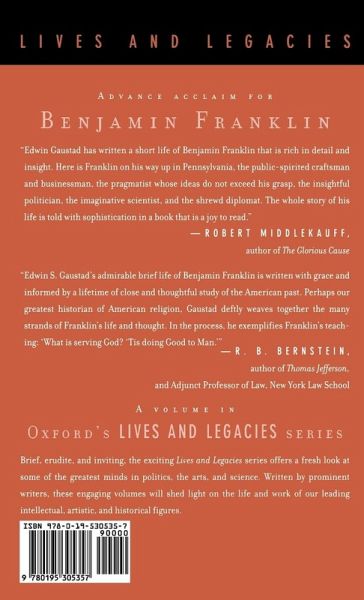 The tenth and youngest son of a poor Boston soapmaker, Benjamin Franklin would rise to become, in Thomas Jefferson's words, "the greatest man and ornament of his age." In this short, engaging biography, historian Edwin S. Gaustad offers a marvelous portrait of this towering colonial figure, illuminating Franklin's character and personality. Here is truly one of the most extraordinary lives imaginable, a man who, with only two years of formal education, became a printer, publisher, postmaster, philosopher, world-class scientist and inventor, statesman, musician, and abolitionist. Gaustad presents a chronological account of all these accomplishments, delightfully spiced with quotations from Franklin's own extensive writings. The book describes how the hardworking Franklin became at age 24 the most successful printer in Pennsylvania and how by 42, with the help of Poor Richard's Almanack, he had amassed enough wealth to retire from business. We then follow Franklin's next brilliant career, as an inventor and scientist, examining his pioneering work on electricity and his inventions of the Franklin Stove, the lightning rod, and bifocals, as well as his mapping of the Gulf Stream, a major contribution to navigation. Lastly, the book covers Franklin's role as America's leading statesman, ranging from his years in England before the Revolutionary War to his time in France thereafter, highlighting his many contributions to the cause of liberty. Along the way, Gaustad sheds light on Franklin's personal life, including his troubled relationship with his illegitimate son William, who remained a Loyalist during the Revolution, and Franklin's thoughts on such topics as religion and morality. Written by a leading authority on colonial America, this compact biography captures in a remarkably small space one of the most protean lives in our nation's history.