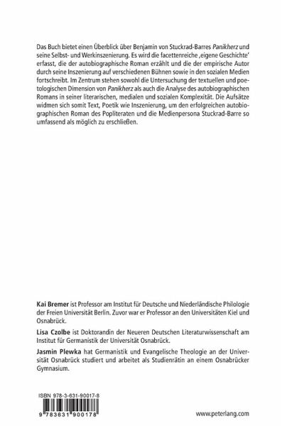 Kai Bremer, Lisa Czolbe, Jasmin Plewka - Einleitung - Text - Till Huber, Immanuel Nover - Pop- Inszenierungen von psychischer Krankheit in Benjamin von Stuckrad- Barres Panikherz - Ricarda Julia Vodermair - Panikherz- Selbst. Literarische Selbstkonstruktion in Benjamin von Stuckrad- Barres Panikherz - Lisa Czolbe - "Wenn ein verlorener Sohn zerzaust [...] nach Hause kommt" - Biblisch- christliche Tradition in Benjamin von Stuckrad- Barres Panikherz - Anke Christensen - "There are no second acts in American lives." Altern, Sterben und Überleben in Hollywood - Poetik - Manuel Bauer - Diesseits der Einflussangst. Konstruktionen literarischer Genealogie in Benjamin von Stuckrad- Barres Panikherz - Jill Thielsen - Semantische Offenheit und die Kategorie 'Heteronomie' - Zu Udo Lindenbergs Liedtexten und ihrer Funktion in Panikherz - Erika Thomalla - Popliteratur im Remix. Benjamin von Stuckrad- Barres Panikherz und die Literatur der 1990er Jahre - Michael Multhammer - "... ins Licht!" Schreiben unter den Bedingungen von Popularität. Benjamin von Stuckrad- Barres Panikherz als Beispiel - Christian Dawidowski - "Leider nur ein Vakuum": Bekenntnisse der Lust und der Lust am Text in Stuckrad- Barres Panikherz - Inszenierung - Anton Bröll - Nach der Autorschaft ist vor der Autorschaft: Das Autorenfoto in Stuckrad- Barres Panikherz als Autorinszenierung und Paramedium mit werkpolitischen Funktionen - Kai Bremer - Das Ineinander von Roman und Autobiographie als Herausforderung für die Inszenierung: Panikherz auf der Bühne - Jasmin Plewka - Die performative Dimension von Literatur am Beispiel einer Lesung von Benjamin von Stuckrad- Barres Panikherz - Alexandra Schütte "Dieser Junge ist doch eigentlich ein prima Typ." - Benjamin von Stuckrad- Barres Panikherz zwischen Selbstinszenierung und Selbsterkenntnis auf Instagram - Verzeichnis der Beiträgerinnen und Beiträger