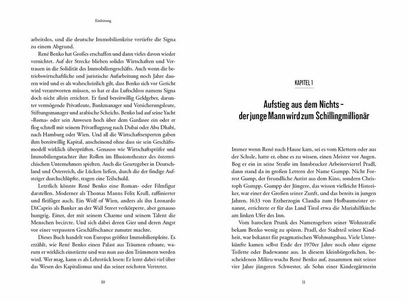 Margret Hucko und Martin Noé, beides erfahrene Wirtschaftsjournalisten liefern eine fundierte und detaillierte Analyse jener Ereignisse, die den steilen Aufstieg eines Schulabbrechers, der mit den Schönen und Reichen auf gleicher Höhe stehen wollte bis hin zu seinem nicht minderen tiefen Fall. Längst sind nicht alle Verstrickungen und Malversationen bekannt, denn derjenige, der das undurchsichtige Firmenkonglomerat erschaffen hat, hüllt sich in Schweigen und leidet an einem selektiven Gedächtnisverlust, der ausgerechnet diese Details betrifft. Die Rede ist von René Benko und seiner Signa-Gruppe, deren Insolvenz nicht nur in Österreich sondern weltweit Baufirmen und Geldgeber zittern. Der stets verwendete Satz „Für ihn gilt die Unschuldsvermutung“ mag angesichts des Schadens, den Benko angerichtet hat, zynisch klingen.