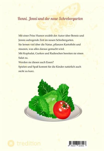 Benni und Jenni erleben einen Schrebergarten. Sie pflanzen Kartoffeln und staunen, welche Lebensmittel daraus entstehen. Aus Kopfsalat, Gurke und Radieschen bereiten sie unter der Anleitung ihrer Mutter einen Salat zu. Essen sie ihn auch?"Hilfe, Mama, hier ist eine riesige Schlange!" , rief die kleine hässliche Kartoffel."Das ist nur ein Regenwurm", antwortete die Mutter. "Regenwürmer sind harmlos."Auch die Sicht der Kartoffeln unter der Erde wird erlebt.Dieses Kinderbuch beschreibt die Natur des Schrebergartens auf humorvolle Weise und die Kinder lernen, dass alle Pflanzen und Tiere wichtig sind.