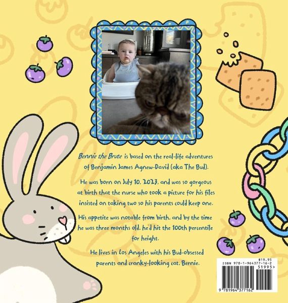 Bennie the Brute is based on the real-life adventures of Benjamin James Agnew-David (aka The Bud). A true love letter to a child written by a first-time mom, Bennie the Brute shows what motherhood is like when you marvel at every last mundane aspect of your beloved child, simply because it's your child. Both a Cancer and a kid who loves nothing more than banging on anything that can make a lot of noise, The Bud is either the sweetest tough guy or the toughest sweet guy on the playground. He was born on July 10, 2023, and was so gorgeous at birth that the nurse who took a picture for his files insisted on taking two so his parents could keep one. From day one, he made his appetite known and by the time he was three months old, he'd hit the 100th percentile for height. Though he far prefers to throw food on the ground than to place it in his mouth-and would much rather munch on cords, sticks, sand or anything that could cause harm and/or sickness-he still manages to consume notable quantities of whatever is placed in front of him. He lives in Los Angeles with his Bud-obsessed parents and cranky-looking cat, Bernie.