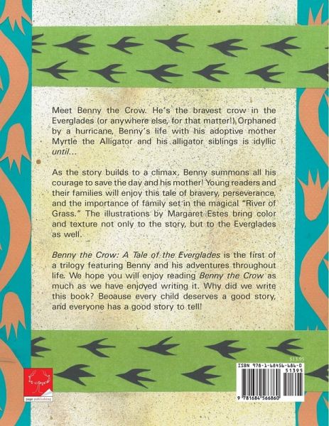 Meet Benny the Crow. He's the bravest crow in the Everglades (or anywhere else, for that matter!) Orphaned by a hurricane, Benny's life with his adoptive mother Myrtle the Alligator and his alligator siblings is idyllic until... As the story builds to a climax, Benny summons all his courage to save the day and his mother! Young readers and their families will enjoy this tale of bravery, perseverance, and the importance of family set in the magical "River of Grass." The illustrations by Margaret Estes bring color and texture not only to the story, but to the Everglades as well. Benny the Crow: A Tale of the Everglades is the first of a trilogy featuring Benny and his adventures throughout life. We hope you will enjoy reading Benny the Crow as much as we have enjoyed writing it. Why did we write this book? Because every child deserves a good story, and everyone has a good story to tell!