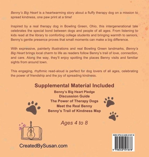 A touching story of kindness awaits... Benny's Big Heart is a heartwarming story about a fluffy therapy dog on a mission to spread kindness, one paw print at a time! Inspired by a real therapy dog in Bowling Green, Ohio, this intergenerational tale celebrates the special bond between dogs and people of all ages. From listening to kids read at the library to comforting college students and bringing warmth to seniors, Benny's gentle presence proves that small moments can make a big difference. With expressive, painterly illustrations and real Bowling Green landmarks, Benny's Big Heart brings local charm to life as readers follow Benny's trail of love, connection, and care. Along the way, they'll enjoy spotting the places Benny visits and familiar sights from around town. This engaging, rhythmic read-aloud is perfect for dog lovers of all ages, celebrating the power of friendship and the joy of spreading kindness. Supplemental Material Included Benny's Big Heart Pledge Discussion Guide The Power of Therapy Dogs Meet the Real Benny Benny's Trail of Kindness Map Follow Benny on his journey today!