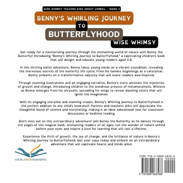 Get ready for a mesmerizing journey through the enchanting world of nature with Benny the Butterfly! Introducing "Benny's Whirling Journey to Butterflyhood," a captivating children's book that will delight and educate young readers aged 3-8. In this thrilling ballet adventure, Benny takes young minds on a vibrant expedition, revealing the marvelous secrets of the butterfly life cycle. From his humble beginnings as a caterpillar, Benny embarks on a transformative odyssey that will leave readers awe-inspired. Through stunning illustrations and an engaging narrative, Benny's story unravels the mysteries of growth and change, introducing children to the wondrous process of metamorphosis. Witness as Benny emerges from his chrysalis, spreading his wings to reveal dazzling colors that will ignite the imagination. But this book is so much more than just a captivating tale. Benny's Whirling Journey to Butterflyhood gently imparts the vital importance of nature and its vibrant palette. Children will learn about the delicate balance of ecosystems and the magic that lies within every fluttering butterfly. Designed with early learning in mind, this book combines education and entertainment seamlessly. As young readers join Benny on his quest, they will absorb valuable knowledge about nature, while also developing a deep appreciation for the beauty that surrounds us. With its engaging storyline and stunning visuals, Benny's Whirling Journey to Butterflyhood is the perfect addition to any child's bookshelf. Parents and teachers alike will appreciate the thoughtful blend of science and storytelling, making it an ideal educational tool for classroom discussions or bedtime reading. Don't miss out on this extraordinary adventure! Join Benny the Butterfly as he dances through the pages of this magical book, enchanting readers of all ages. Let the wonder of nature unfold before your eyes and inspire a love for learning that will last a lifetime. Experience the thrill of growth, the joy of change, and the brilliance of nature in Benny's Whirling Journey to Butterflyhood. Get your copy today and embark on an extraordinary adventure that will captivate hearts and minds alike!