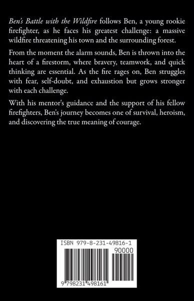 Ben's Battle with the Wildfire follows Ben, a young rookie firefighter, as he faces his greatest challenge: a massive wildfire threatening his town and the surrounding forest. From the moment the alarm sounds, Ben is thrown into the heart of a firestorm, where bravery, teamwork, and quick thinking are essential. As the fire rages on, Ben struggles with fear, self-doubt, and exhaustion but grows stronger with each challenge. With his mentor's guidance and the support of his fellow firefighters, Ben's journey becomes one of survival, heroism, and discovering the true meaning of courage.