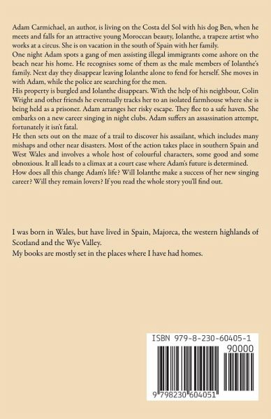 Adam Carmichael, an author, is living on the Costa del Sol with his dog Ben, when he meets and falls for an attractive young Moroccan beauty, Iolanthe, a trapeze artist who works at a circus. She is on vacation in the south of Spain with her family. One night Adam spots a gang of men assisting illegal immigrants come ashore on the beach near his home. He recognises some of them as the male members of Iolanthe's family. Next day they disappear leaving Iolanthe alone to fend for herself. She moves in with Adam, while the police are searching for the men. His property is burgled and Iolanthe disappears. With the help of his neighbour, Colin Wright and other friends he eventually tracks her to an isolated farmhouse where she is being held as a prisoner. Adam arranges her risky escape. They flee to a safe haven. She embarks on a new career singing in night clubs. Adam suffers an assassination attempt, fortunately it isn't fatal. He then sets out on the maze of a trail to discover his assailant, which includes many mishaps and other near disasters. Most of the action takes place in southern Spain and West Wales and involves a whole host of colourful characters, some good and some obnoxious. It all leads to a climax at a court case where Adam's future is determined. How does all this change Adam's life? Will Iolanthe make a success of her new singing career? Will they remain lovers? If you read the whole story you'll find out.