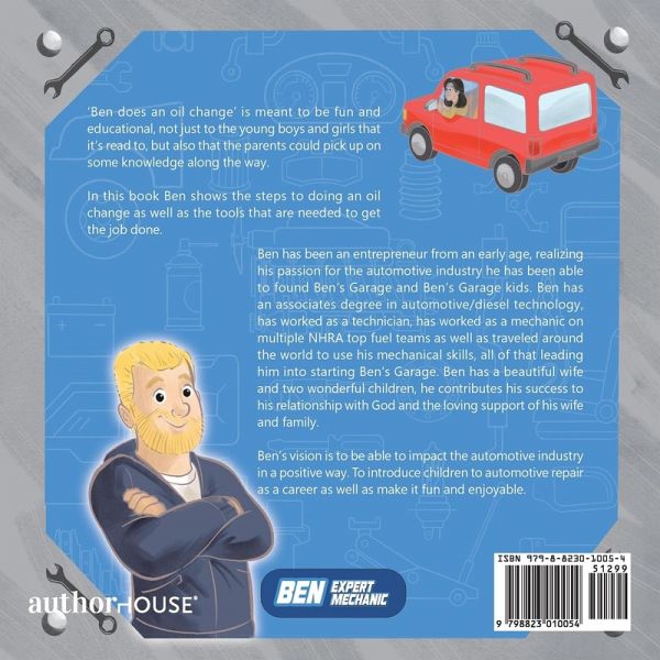 'Ben does an oil change' is meant to be fun and educational, not just to the young boys and girls that it's read to, but also that the parents could pick up on some knowledge along the way. In this book Ben shows the steps to doing an oil change as well as the tools that are needed to get the job done.