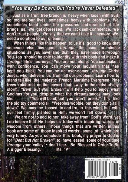 So, you've been through the storm, swept over the coals, and you're wondering how to get through this hell. "Bent But Not Broken" is a book about how God has help me through trials, and helps you see how to make it too. Only through Christ Jesus can you succeed. Some people watch soap operas because the lives of the characters are worse than the viewer's own life. Life isn't a soap opera, and seeing some of the trials that another person encounters on TV won't help get you through your situation.You can bend in the wind and God's grace will carry you. You can climb over any mountain and God's grace will sustain you. Through the storms of life, God's grace will carry you. Grace is that favor that none of us deserve, yet it is our bridge over troubled waters and the calm through any storm. Our feet can be anchored so strongly in Him that we will bend a little, yet nothing can break our faith in God our Father.