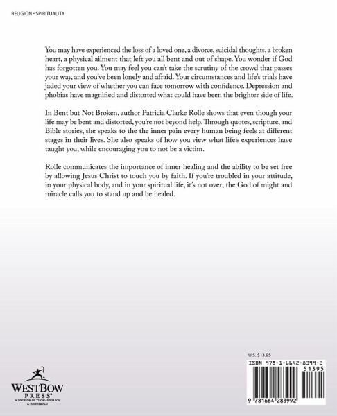 You may have experienced the loss of a loved one, a divorce, suicidal thoughts, a broken heart, a physical ailment that left you all bent and out of shape. You wonder if God has forgotten you. You may feel you can't take the scrutiny of the crowd that passes your way, and you've been lonely and afraid. Your circumstances and life's trials have jaded your view of whether you can face tomorrow with confidence. Depression and phobias have magnified and distorted what could have been the brighter side of life. In Bent but Not Broken, author Patricia Clarke Rolle shows that even though your life may be bent and distorted, you're not beyond help. Through quotes, scripture, and Bible stories, she speaks to the the inner pain every human being feels at different stages in their lives. She also speaks of how you view what life's experiences have taught you, while encouraging you to not be a victim. Rolle communicates the importance of inner healing and the ability to be set free by allowing Jesus Christ to touch you by faith. If you're troubled in your attitude, in your physical body, and in your spiritual life, it's not over; the God of might and miracle calls you to stand up and be healed.