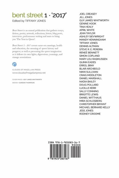 Bent Street is an annual publication that gathers essays, fiction, poetry, artwork, reflections, letters, blog posts, interviews, performance writing and rants to bring you ‘The Year in Queer’. "Bent Street 1 - 2017" covers same-sex marriage, health an education, the meaning of queer history and progress; as well as presenting the queer imagination as it follows its own lights, digressions, yearnings, and strange associations. Joel Creasey, Jill Jones, Guy James Whitworth, Genine Hook, Tina Healy, April White, Jean Taylor, Ashley Sievwright, Mandy Henningham, Tiffany Jones, Dennis Altman, Steve R. E. Pereira, Renee Bennett, Simon Copland, Mary Lou Rasmussen, Quinn Eades, Errol Bray, Blair Archbold, Nikki Sullivan, Craig Middleton, Daniel Marshall, Nadia Bailey, Doug Pollard, Lucille Kerr, Sally Conning, Brigitte Lewis, Daniel Witthaus, Mira Schlosberg, Christopher Bryant, Michael Bernard Kelly, Jess Jones, Rodney Croom.