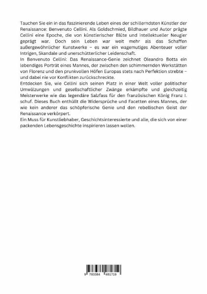 Tauchen Sie ein in das faszinierende Leben eines der schillerndsten Künstler der Renaissance: Benvenuto Cellini. Als Goldschmied, Bildhauer und Autor prägte Cellini eine Epoche, die von künstlerischer Blüte und intellektueller Neugier geprägt war. Doch sein Leben war weit mehr als das Schaffen außergewöhnlicher Kunstwerke - es war ein wage-mutiges Abenteuer voller Intrigen, Skandale und unerschütterlicher Leidenschaft.In Benvenuto Cellini: Das Renaissance-Genie zeichnet Oleandro Botta ein lebendiges Porträt eines Mannes, der zwischen den schimmernden Werkstätten von Florenz und den prunkvollen Höfen Europas stets nach Perfektion strebte - und dabei nie vor Konflikten zurückschreckte.Entdecken Sie, wie Cellini sich seinen Platz in einer Welt voller politischer Umwälzungen und gesellschaftlicher Zwänge erkämpfte und gleichzeitig Meisterwerke wie das legendäre Salzfass für den französischen König Franz I. schuf. Dieses Buch enthüllt die Widersprüche und Facetten eines Mannes, der wie kein anderer das schöpferische Genie und den rebellischen Geist der Renaissance verkörpert.Ein Muss für Kunstliebhaber, Geschichtsinteressierte und alle, die sich von einer packenden Lebensgeschichte inspirieren lassen wollen.