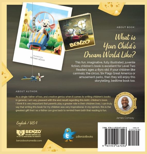 What is Your Child's Dream World Like? This fun, imaginative, fully illustrated, 48 pages, juvenile fiction, children's picture book is excellent for Early and Level Two Readers ages 4-8 years-old. This cute, cuddly, little mouse not only loves eating cheese, but he also has a big imagination that tastes like his favorite food. In this short story easy reader picture book, you will be part of Benzo's Dream Cheese World. If your children like carnivals, the circus, Six Flags Great America or amusement parks, then they will enjoy this storytelling, bedtime, kids book too. Benzo adventure takes place at an amusement park filled with excitement and fun. This Dr. Who of time travel not only likes to eat cheese, but dreams big while having fun too. Every time that this mouse falls asleep from his beauty rest, his magical world begins in his mind. The only obstacle that he has to face is time itself before he awakens from his sleep. Once he opens his eyes from sleeping, his magical world of fun comes to an end too.