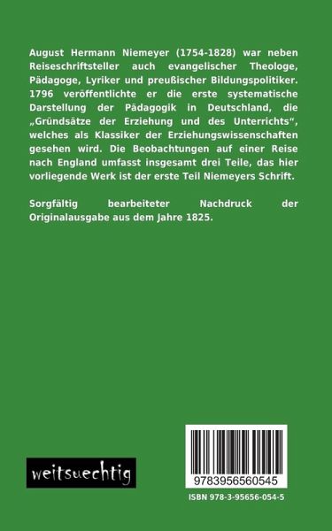 August Hermann Niemeyer (1754-1828) war neben Reiseschriftsteller auch evangelischer Theologe, Pädagoge, Lyriker und preußischer Bildungspolitiker. 1796 veröffentlichte er die erste systematische Darstellung der Pädagogik in Deutschland, die Gründsätze der Erziehung und des Unterrichts , welches als Klassiker der Erziehungswissenschaften gesehen wird. Die Beobachtungen auf einer Reise nach England umfasst insgesamt drei Teile, das hier vorliegende Werk ist der erste Teil Niemeyers Schrift.