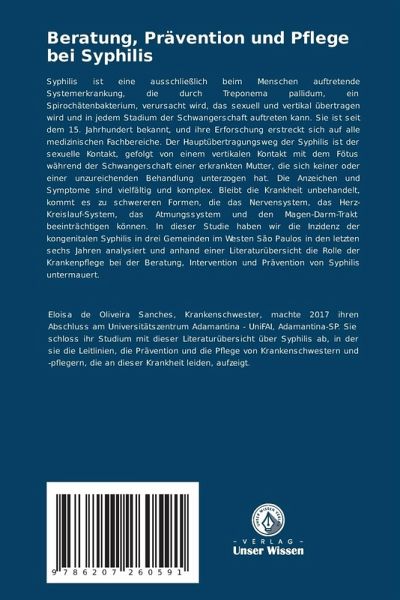Syphilis ist eine ausschließlich beim Menschen auftretende Systemerkrankung, die durch Treponema pallidum, ein Spirochätenbakterium, verursacht wird, das sexuell und vertikal übertragen wird und in jedem Stadium der Schwangerschaft auftreten kann. Sie ist seit dem 15. Jahrhundert bekannt, und ihre Erforschung erstreckt sich auf alle medizinischen Fachbereiche. Der Hauptübertragungsweg der Syphilis ist der sexuelle Kontakt, gefolgt von einem vertikalen Kontakt mit dem Fötus während der Schwangerschaft einer erkrankten Mutter, die sich keiner oder einer unzureichenden Behandlung unterzogen hat. Die Anzeichen und Symptome sind vielfältig und komplex. Bleibt die Krankheit unbehandelt, kommt es zu schwereren Formen, die das Nervensystem, das Herz-Kreislauf-System, das Atmungssystem und den Magen-Darm-Trakt beeinträchtigen können. In dieser Studie haben wir die Inzidenz der kongenitalen Syphilis in drei Gemeinden im Westen São Paulos in den letzten sechs Jahren analysiert und anhand einer Literaturübersicht die Rolle der Krankenpflege bei der Beratung, Intervention und Prävention von Syphilis untermauert.