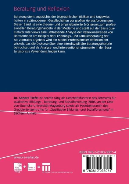 Beratung steht angesichts der biographischen Risiken und Ungewissheiten in spätmodernen Gesellschaften vor großen Herausforderungen. Dieser Band ist eine theorie- und empiriebasierte Erörterung zum professionellen Beratungshandeln in der Moderne und stellt auf der Basis qualitativer Interviews eine umfassende Analyse der Reflexionsweisen von BeraterInnen am Beispiel der Ferziehungs- und Familienberatung dar. Als zentrales Ergebnis wird ein Modell Professioneller Reflexion entwickelt, das die Diskurse über eine interdisziplinäre Beratungstherorie befruchtet und als Analyse- und Interventionsinstrumente in der Beratungspraxis Vewendung finden kann.