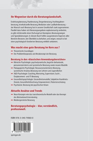 Dabei ist Beratung zwar kein spezifisch psychologisches Feld, aber in all diesen Feldern arbeiten auch Psychologen. Die "Beratungspsychologie" konzentriert sich auf die "vier klassischen Anwendungsbereiche"