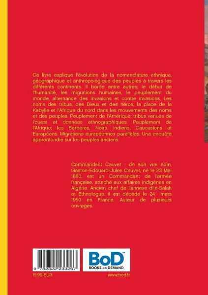 Ce livre explique l'évolution de la nomenclature ethnique, géographique et anthropologique des peuples à travers les différents continents. Il borde entre autres; le début de l'humanité, les migrations humaines, le peuplement du monde, alternance des invasions et contre invasions, les noms des tribus, des croyances et des héros. La place de la Kabylie et l'Afrique du nord dans les mouvements des noms et des peuples. Peuplement de l'Amérique; tribus venues de l'ouest et données ethnographiques. Peuplement de l'Afrique; la Berbérie, les noirs, indiens, Caucasiens et Européens. Migrations européennes parallèles.
