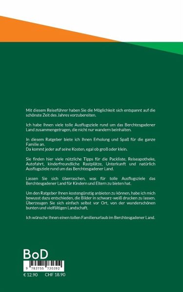 Mit diesem Reiseführer haben Sie die Möglichkeit sich entspannt auf die schönste Zeit des Jahres vorzubereiten.Ich habe Ihnen viele tolle Ausflugsziele rund um das Berchtesgadener Land zusammengetragen, die nicht nur wandern beinhalten.In diesem Ratgeber biete ich Ihnen Erholung und Spaß für die ganze Familie an. Da kommt jeder auf seine Kosten, egal ob groß oder klein.Sie finden hier viele nützliche Tipps für die Packliste, Reiseapotheke, Autofahrt, kinderfreundliche Rastplätze, Unterkunft und natürlich Ausflugsziele rund um das Berchtesgadener Land. Lassen Sie sich überraschen, was für tolle Ausflugsziele das Berchtesgadener Land für Kindern und Eltern zu bieten hat.Um den Ratgeber Ihnen kostengünstig anbieten zu können, habe ich mich bewusst dazu entschieden, die Bilder in schwarz-weiß drucken zu lassen. Überzeugen Sie sich einfach selbst vor Ort, von der wunderschönen bunten und vielfältigen Landschaft.Ich wünsche Ihnen einen tollen Familienurlaub im Berchtesgadener Land.