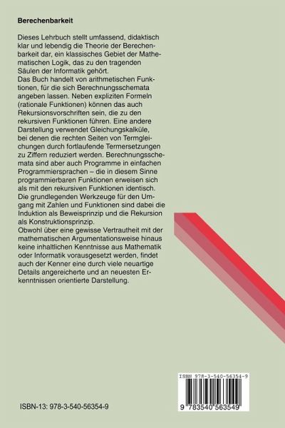 Dieses Lehrbuch behandelt verständlich, umfassend und modern die Theorie der Berechenbarkeit, ein klassisches Gebiet der Mathematischen Logik, das als Grundlagengebiet auch für die Informatik von höchster Bedeutung ist. Lebendig und didaktisch klar wird das Studium der berechenbaren Funktionen auf dem Programmbegriff aufgebaut. Dabei sind die Induktion als Beweisprinzip und die Rekursion als Konstruktionsprinzip die beiden grundlegenden Werkzeuge für den Umgang mit Zahlen und Funktionen. Obwohl über eine gewisse Vertrautheit mit der mathematischen Argumentationsweise hinaus keine inhaltlichen Kenntnisse aus der Mathematik oder der Informatik vorausgesetzt werden, findet auch der Kenner eine durch viele neuartige Details angereicherte und an neuesten Ergebnissen orientierte Darstellung.