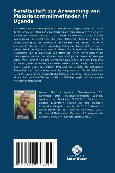 Mein Name ist Wadunde Ignatius. Geboren und aufgewachsen bin ich im Bezirk Tororo im Osten Ugandas. Nach meinem Bachelor-Abschluss an der Makerere-Universität kehrte ich in meine Heimatstadt zurück, um als medizinischer Labortechniker bei der Infectious Diseases Research Collaboration (IDRC) im allgemeinen Krankenhaus des Bezirks Tororo zu arbeiten. In diesem armen, ländlichen Bezirk von Tororo gibt es, wie in jedem Bezirk in Uganda, viele Probleme im Bereich der öffentlichen Gesundheit, die zu Morbidität und Mortalität führen, insbesondere bei schwangeren Müttern und Kindern unter fünf Jahren. Diese Erfahrungen haben mein Interesse an der öffentlichen Gesundheit geweckt. Im Distrikt Tororo in Uganda ist Malaria, wie in den meisten Ländern südlich der Sahara und weltweit, eines der größten Probleme im Bereich der öffentlichen Gesundheit und nach wie vor eine der Hauptursachen für Morbidität und Mortalität sowie für die wirtschaftliche Belastung. In dieser Studie wurde die Bereitschaft zur Durchführung von IRS zur Malariaprophylaxe in den eigenen vier Wänden untersucht.