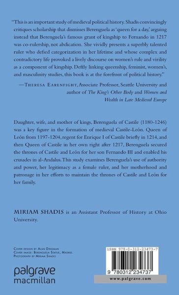 "This is an important study of medieval political history. Shadis convincingly critiques scholarship that dismisses Berenguela as 'queen for a day,' arguing instead that Berenguela's famous grant of kingship to Fernando in 1217 was co-rulership, not abdication.She vividly presents a superbly talented ruler who defied categorization in her lifetime and whose complex and contradictory life provoked a lively discourse on women's rule and virility as a component of kingship. Deftly linking queenship, feminist, women's, and masculinity studies, this book is at the forefront of political history." - Theresa Earenfight, Associate Professor, Seattle University and author of The King's Other Body: María of Castile and the Crown of Aragon