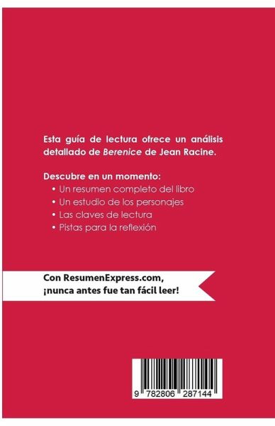ResumenExpress.com presenta y analiza en esta guía de lectura Berenice, una tragedia en cinco actos que narra la historia de Berenice, reina de Palestina, a quien su amante, Tito, decide dejar cuando es nombrado emperador ¿a pesar de estar perdidamente enamorado de ellä, puesto que Roma no ve la realeza con buenos ojos. Al sufrimiento de ambos se le suma el de Antíoco, rey de Comagene y amigo de Tito, también enamorado de la protagonista. ¡Ya no tienes que leer y resumir todo el libro, nosotros lo hemos hecho por ti! Esta guía incluye: ¿ Un resumen completo del libro ¿ Un estudio de los personajes ¿ Las claves de lectura ¿ Pistas para la reflexión ¿Por qué elegir ResumenExpress.com? Para aprender de forma rápida. Porque nuestras publicaciones están escritas con un estilo claro y conciso que te ayudará a ganar tiempo y a entender las obras sin esfuerzo. Disponibles en formato impreso y digital, te acompañarán en tu aventura literaria. Toma una dosis de literatura acelerada con ResumenExpress.com