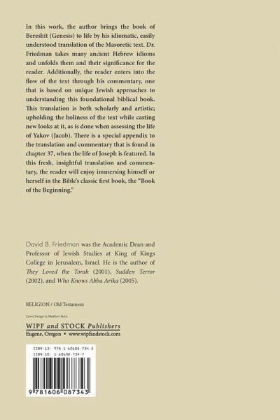 In this work, the author brings the book of Bereshit (Genesis) to life by his idiomatic, easily understood translation of the Masoretic text. Dr. Friedman takes many ancient Hebrew idioms and unfolds them and their significance for the reader. Additionally, the reader enters into the flow of the text through his commentary, one that is based on unique Jewish approaches to understanding this foundational biblical book. This translation is both scholarly and artistic; upholding the holiness of the text while casting new looks at it, as is done when assessing the life of Yakov (Jacob). There is a special appendix to the translation and commentary that is found in chapter 37, when the life of Joseph is featured. In this fresh, insightful translation and commentary, the reader will enjoy immersing himself or herself in the Bible's classic first book, the 'Book of the Beginning.'
