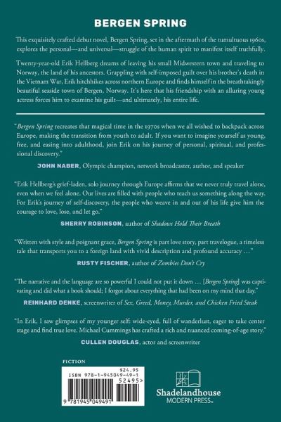 This exquisitely crafted debut novel, Bergen Spring, set in the aftermath of the tumultuous 1960s, explores the personal-and universal-struggle of the human spirit to manifest itself truthfully. Twenty-year-old Erik Hellberg dreams of leaving his small Midwestern town and traveling to Norway, the land of his ancestors. Grappling with self-imposed guilt over his brother's death in the Vietnam War, Erik hitchhikes across northern Europe and finds himself in the breathtakingly beautiful seaside town of Bergen, Norway. It's here that his friendship with an alluring young actress forces him to examine his guilt-and ultimately, his entire life.