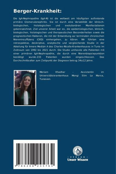 Die IgA-Nephropathie (IgA-N) ist die weltweit am häufigsten auftretende primäre Glomerulonephritis. Sie ist durch eine Variabilität der klinisch-biologischen, histologischen und evolutionären Manifestationen gekennzeichnet. Ziel unserer Arbeit war es, die epidemiologischen, klinisch-biologischen, histologischen und therapeutischen Besonderheiten sowie die prognostischen Faktoren, die mit der Entwicklung zur terminalen chronischen Niereninsuffizienz (CKD) einhergehen, zu klären. Wir führten eine retrospektive, deskriptive, analytische und vergleichende Studie in der Abteilung für Innere Medizin A des Charles-Nicolle-Krankenhauses in Tunis im Zeitraum von 1992 bis 2021 durch. Die Studie umfasste alle Patienten mit einer primären IgA-Nephropathie, die durch eine Nierenbiopsiepunktion bestätigt wurde.233 Patienten wurden eingeschlossen. Das Durchschnittsalter zum Zeitpunkt der Diagnose betrug 34±12 Jahre.