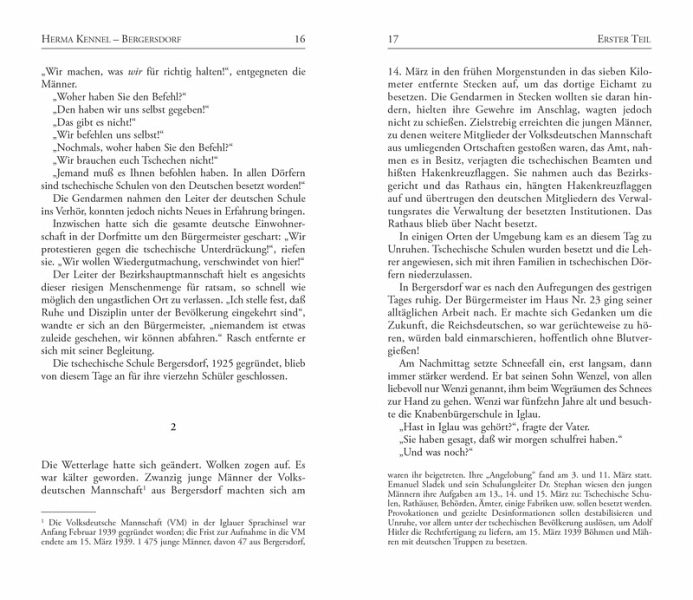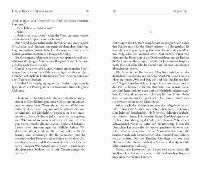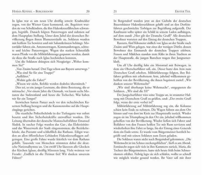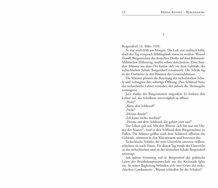 15. März 1939. Hitlers Wehrmacht marschiert in die "Rest-Tschechei" ein. In der deutschen Sprachinsel Iglau feiern die Bewohner den Einmarsch als Befreiung. Der Chef des SS-Hauptamtes, Gottlob Berger, reist aus Berlin an und erklärt "sein" Bergersdorf zu einem SS-Dorf. Ohne sich viele Gedanken zu machen, treten nun die meisten Männer der All¬ge¬meinen SS bei. Auch der Bürgermeister der Ortschaft, Wenzel Hondl, kann sich dem Geschehen nicht entziehen. Doch die Szene verfinstert sich zunehmend, und immer mehr Mütter trauern um ihre gefallenen Söhne. Bitter muß Bürgermeister Hondl erkennen: "Wir wollten uns von den Tschechen befreien und sind Hitler in die Hände gefallen." Im Mai 1945 kommt es schließlich zur Katastrophe ...Herma Kennel hat die brutalen Ereignisse in ihrem Tatsachenroman mit größter Objektivität erzählt. Ihr Buch löst schließlich Polizeiermittlungen aus und läßt die Behörden das im Roman erwähnte Massengrab öffnen. Wochenlang berichten die tschechische und internationale Presse von der "Budinka"-Wiese, die bald zu einem Symbol der verdrängten Nachgeschichte des Weltkriegs wird. In einem kurzweiligen Nachwort blickt die Autorin erstmals auf die Folgen zurück, die das Erscheinen ihres Werkes auslöste.