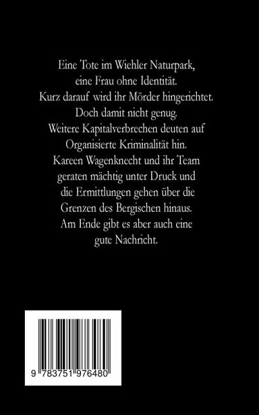 Nicht zu fassen. Kareen Wagenknecht, Chefin der Kripo Gummersbach, ist ja schon allerhand gewohnt. Aber von heute auf morgen drei Mordopfer, das musste wirklich nicht sein. Erbarmungslos getötet und nicht gerade pietätvoll entsorgt. Ihre Ermittlungen nach dem Hintergrund, was die ermordete dunkelhäutige Frau mit Designerklamotten und High Heels im Wiehler Naturpark zu suchen hatte, laufen ins Leere. Als die Mörder dann selbst dran glauben mussten, wurde es so richtig spannend. Und ob das alles nicht schon genug wäre, hängt ihr Lebensgefährte auch noch im Schlamassel mit drin. Es geht hart an die Grenzen ihrer Belastbarkeit, doch da zeigt sich, dass sie ein Team hat, das hinter ihrer Chefin steht. Auch Blumberg, ehemals Leiter der Kripo Köln und Max, der Chef aller Polizeihunde, lassen nicht eher locker, bis das Bergische wieder sauber ist.