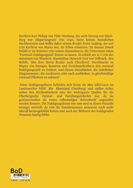 Kurfürst Karl Philipp von Pfalz-Neuburg, der auch Herzog von Jülich-Berg war (Regierungszeit 1716-1742), hatte keinen männlichen Nachkommen und wollte daher seinen Bruder Franz Ludwig, der seit 1729 Kurfürst von Mainz war, als Erben einsetzen. Zu diesem Zweck befahl er im Sommer 1730 seinen Amtmännern, die Untertanen einen "Eventual-Huldigungseid" leisten zu lassen. So erhielt am 21.7.1730 der Amtmann von Windeck, Maximilian Heinrich Graf von Velbrück, den Befehl, "ahn dero Herrn Bruder auch Churfürstl. Durchlaucht zu Maynz von hiesigen Beamten und Gerichtsschreibern den eventual Huldigungsaydt zu fordern, und diesen einzubinden, die sämtlichen Eingesessenen, die erschienen oder auch ausblieben, in gleichmäßige eventual Pflichten zu nehmen". Diese Huldigungslisten befinden sich heute als Akte (JBII/2417) im Landesarchiv NRW. Abt. Rheinland (Duisburg) und stellen sicher neben den Kirchenbüchern eine der wichtigsten Quellen für die Oberbergische Heimat- und Familiengeschichte dar, da sie gewissermaßen als erstes vollständiges "Adressbuch" angesehen werden können. Die Huldigungslisten von 1666 sind in dieser Hinsicht weniger wertvoll, da sich die Familiennamen seinerzeit noch nicht überall herausgebildet hatten und auch der Wohnort der huldigenden Personen häufig fehlte.